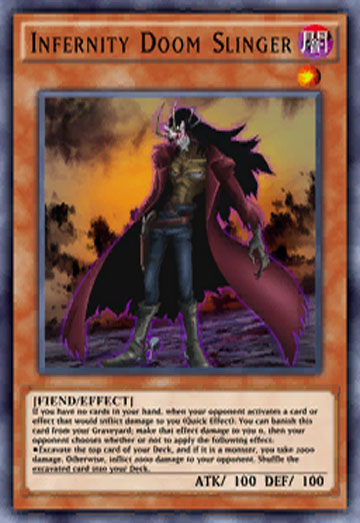 If you have no cards in your hand, when your opponent activates a card or effect that would inflict damage to you (Quick Effect): You can banish this card from your Graveyard; make that effect damage to you 0, then your opponent chooses whether or not to apply the following effect: ● Excavate the top card of your Deck, and if it is a monster, inflict 2000 to your opponent. Otherwise, you take 2000 damage. Shuffle the excavated card into your Deck.
