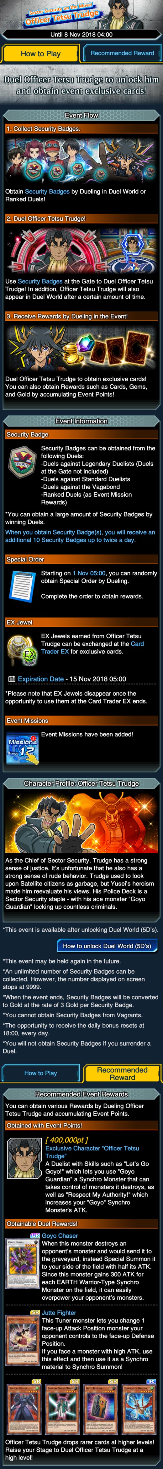 - Everyone’s favourite Sector Security Officer, Tetsu Trudge has arrived! Duel him to obtain all new card rewards and unlock him at 400,000 points!