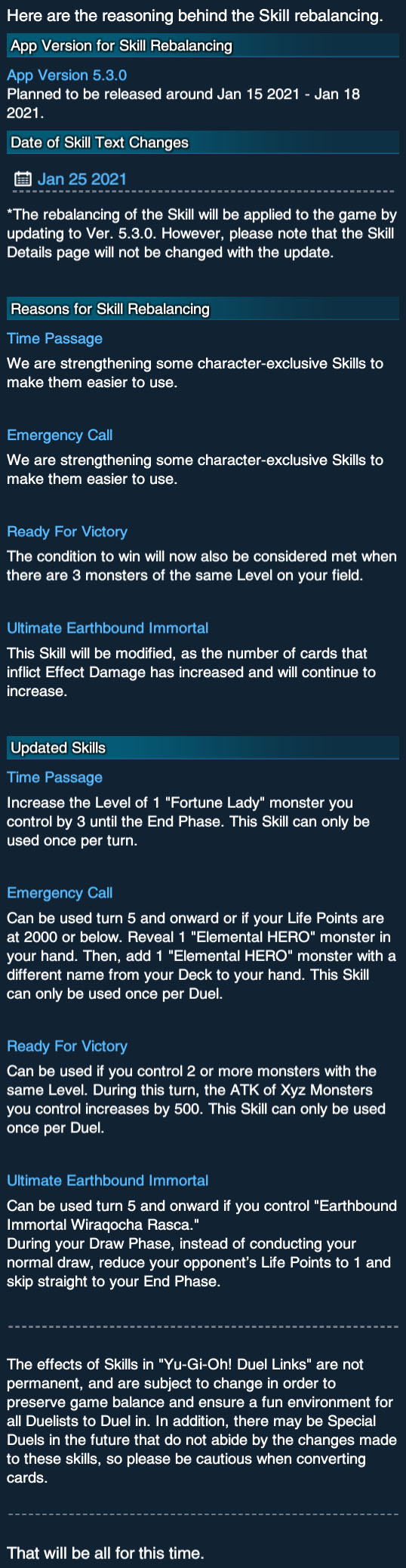 The Skill Changes will go into effect by updating to 5.3.0, which will be released around January 15th - 17th.