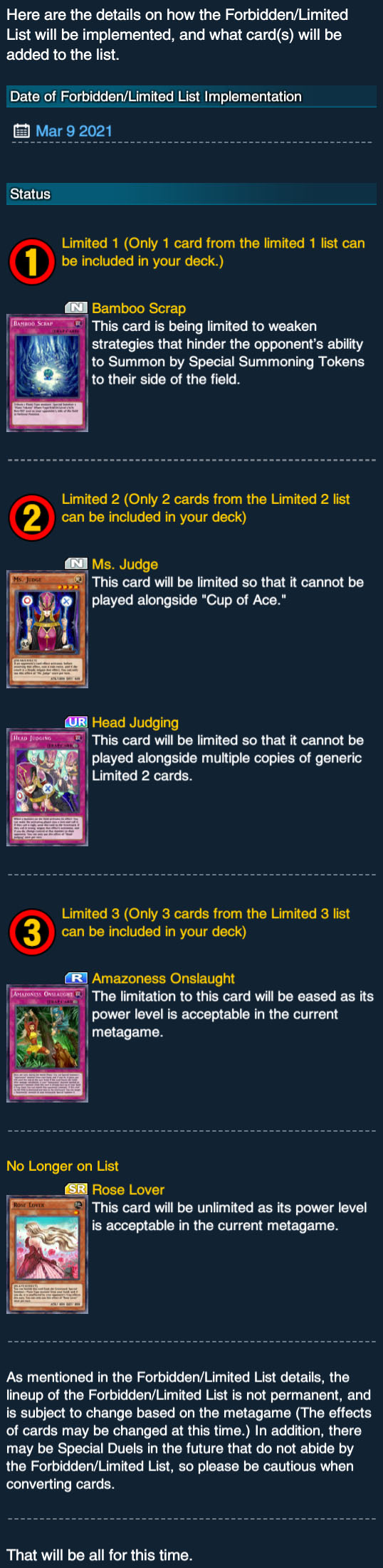 The Forbidden/Limited List will be updated on March 9th with new cards added to the list: