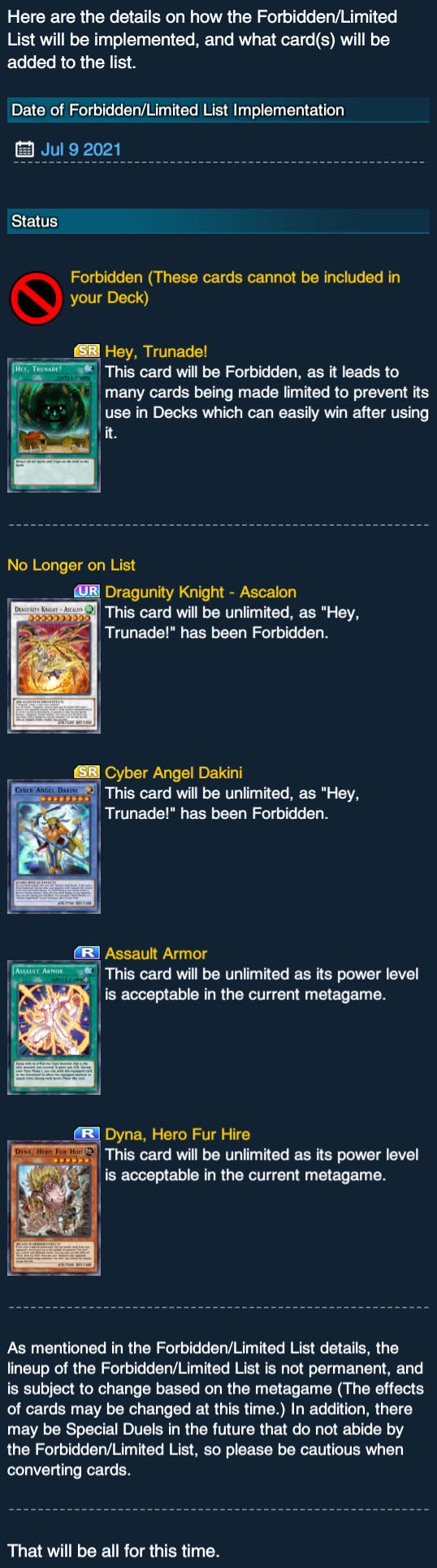- Dragunity Knight - Ascalon, Cyber Angel Dakini, Assault Armor, and Dyna, Hero Fur Hire are no longer on the list.