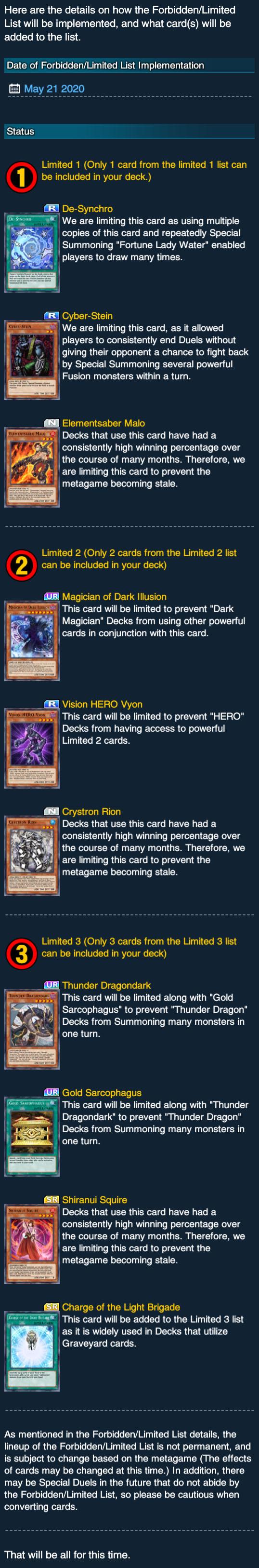- De-Synchro, Cyber-Stein, and Elementsaber Malo will be added to the Limited 1 List.