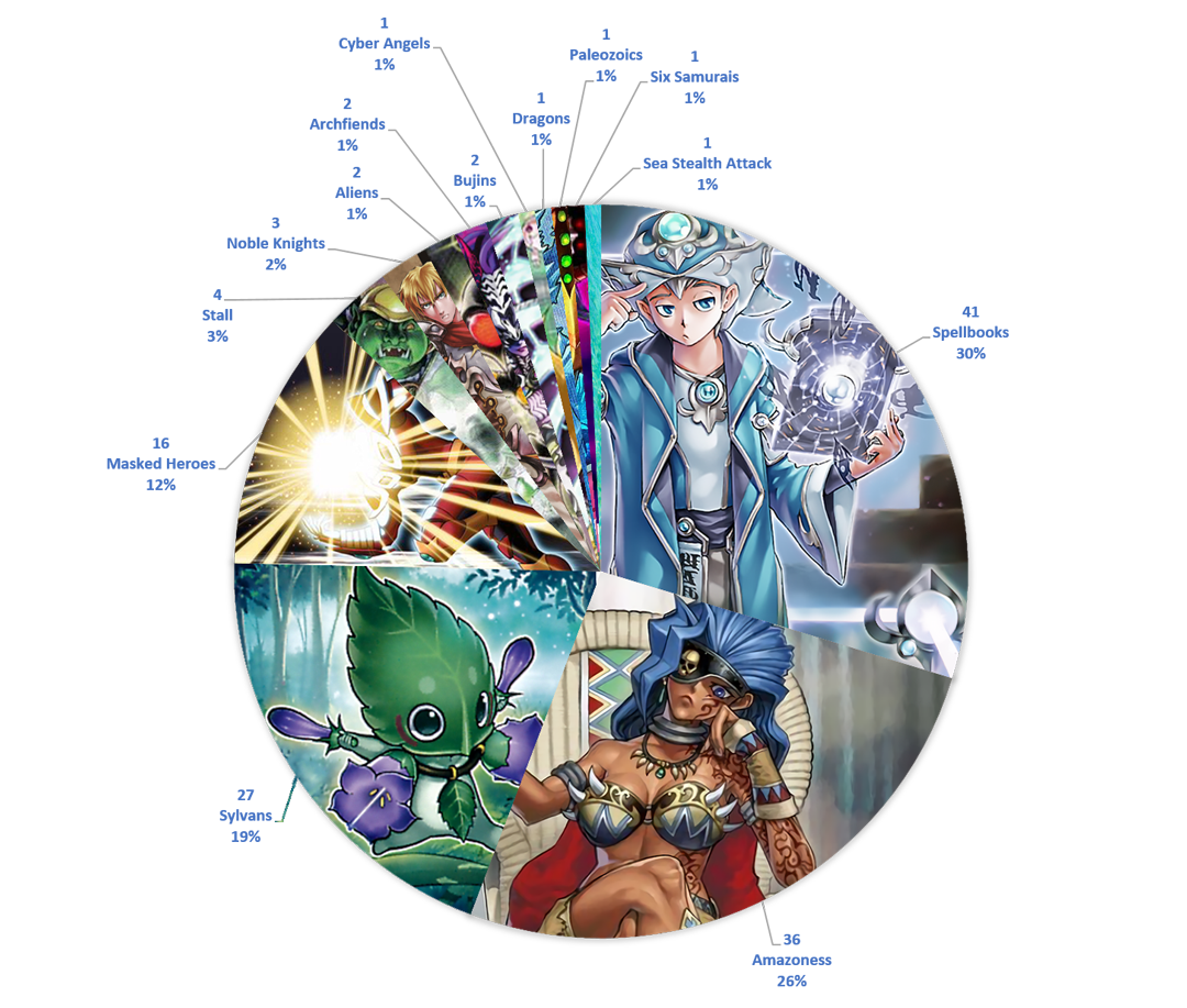 |–|–|–| | Spellbooks | | 41 Restart | | Amazoness | | 36 Restart | | Sylvans | 26 Grit | 1 Restart | | Masked Heroes | 15 Restart | 1 Grit | | Stall | 3 Extra, Extra | 1 Destiny Draw | | Noble Knights | 2 Balance | 1 Restart | | Aliens | | 2 Restart | | Archfiends | | 2 Restart | | Bujins | | 2 Restart | | Cyber Angels | | 1 Grit | | Dragons | | 1 Restart | | Paleozoics | | 1 Chain Reaction | | Six Samurais | | 1 Beatdown | | Sea Stealth Attack | | 1 Mythic Depths |